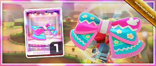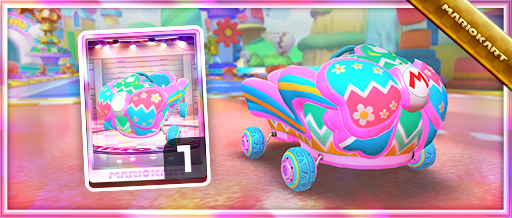 And don’t forget the Bright Girl kart and the Bright Ribbon glider. We noticed the design is the same Easter theme as spring eggs. That’s bright and colorful, and the details are amazing. Let’s take the Bright Girl kart to the race and use Jump Boost Plus to come in the very first place on the race. Fend off all the attacks with Super Horn Plus from the Bright Ribbon glider. What a perfect skill for our Poochy!